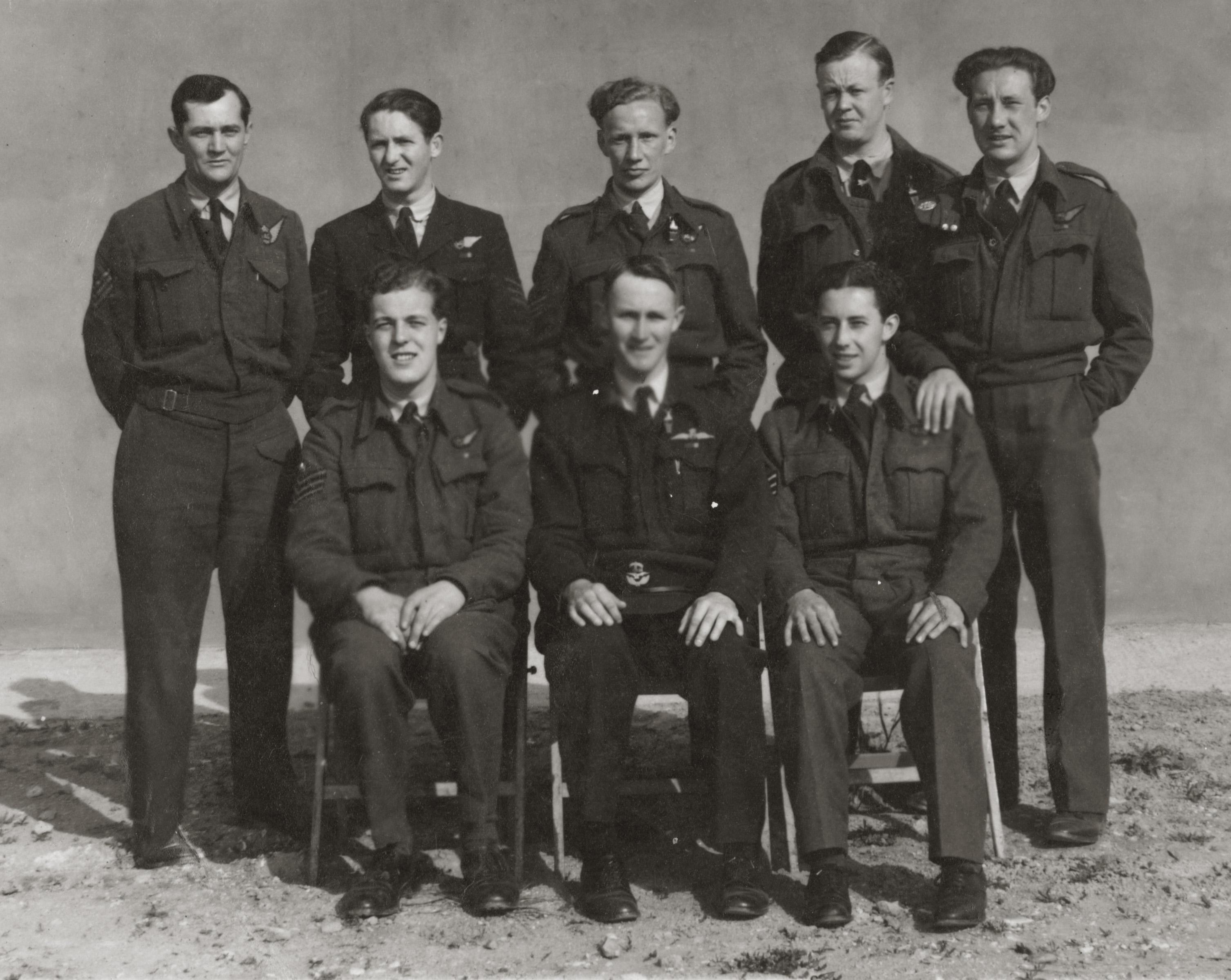 FS Jim Blake ; Flt/Lt Len Sheel, or Shiel, DFM ; FS Al Schaeffer RCAF ; Sqd/Ldr Ralph Van Den Bok ; FS "Smithy" Smith RCAF ; FS John Tudor Mills ; Sgt Herbert Harker ; FS Jim Green ; FS Howard Plumber.