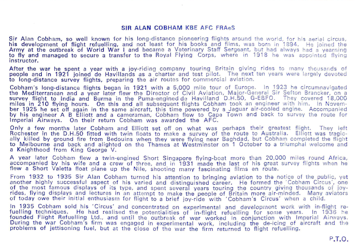 Flew to RAF Luqa and return to RAF Marham on 20th to 22nd July 1976 on an air to air refueling operation to commemorate the 50th Anniversary of Sir Alan Cobham KBE AFC FRAeS fliying to Australia and back.